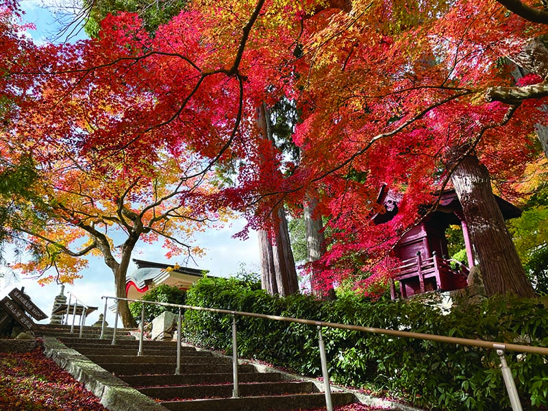 写真の紅葉は、尾関山から国道を隔てた鳳源寺・義士堂へ登る石段です。(昨年の写真)